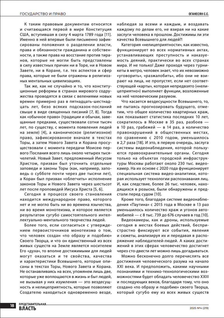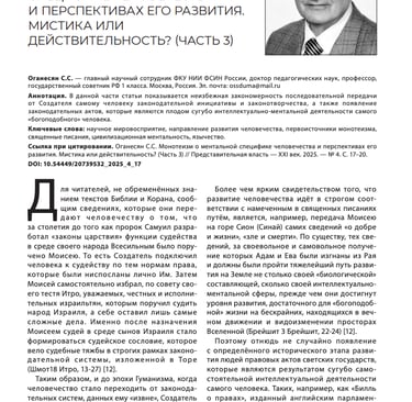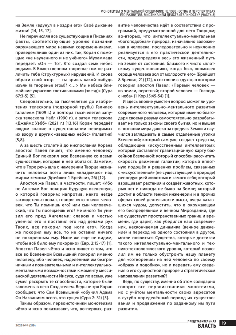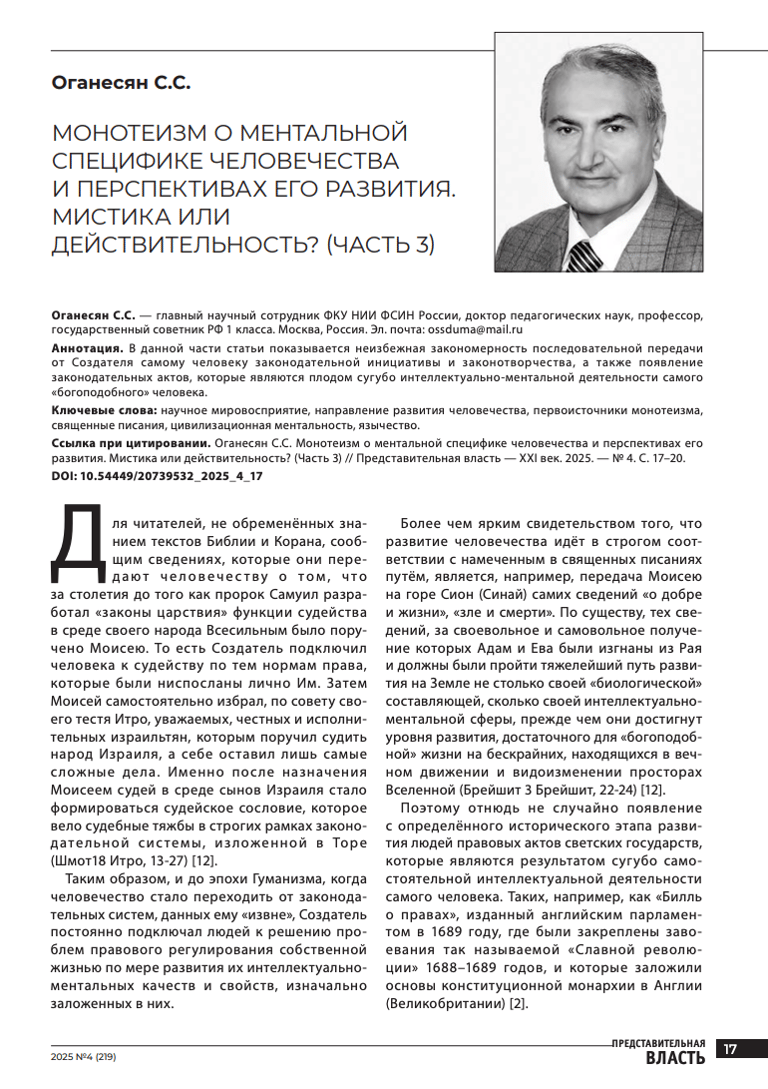 Ссылка при цитировании. Оганесян С.С. Монотеизм о ментальной специфике человечества и перспективах его развития. Мистика или действительность? (Часть 3) // Представительная власть — XXI век. 2025. — № 4. С. 17–20